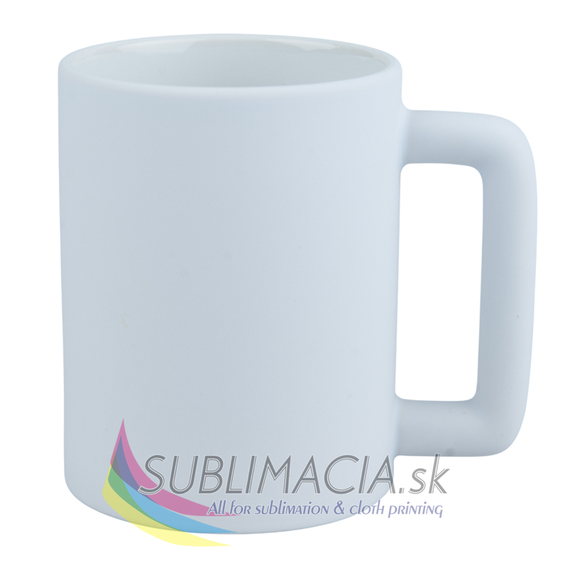 Biely keramický matný hrnček s povrchovou úpravou určenou na sublimačnú potlač. Potlač je možná po obvode hrnčeka.